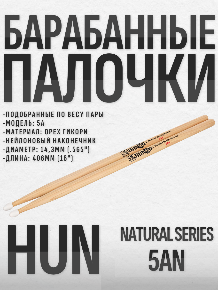 Барабанные палочки, орех гикори, нейлон наконечник, HUN Natural Series 5AN
