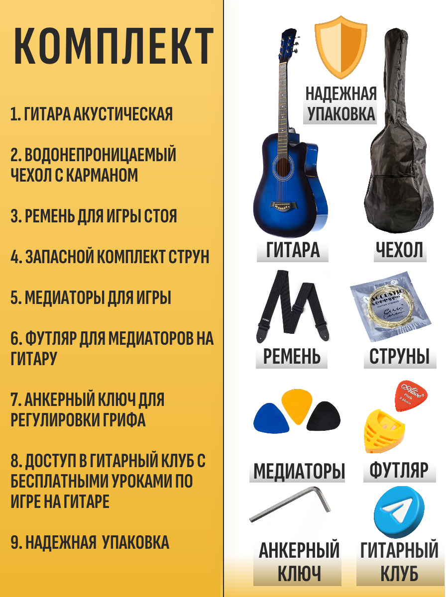 Набор гитариста: гитара с чехлом, запасной комплект струн, ремень, медиаторы для игры, футляр для медиаторов, анкерный ключ, надежная упаковка, доступ в онлайн школу в подарок