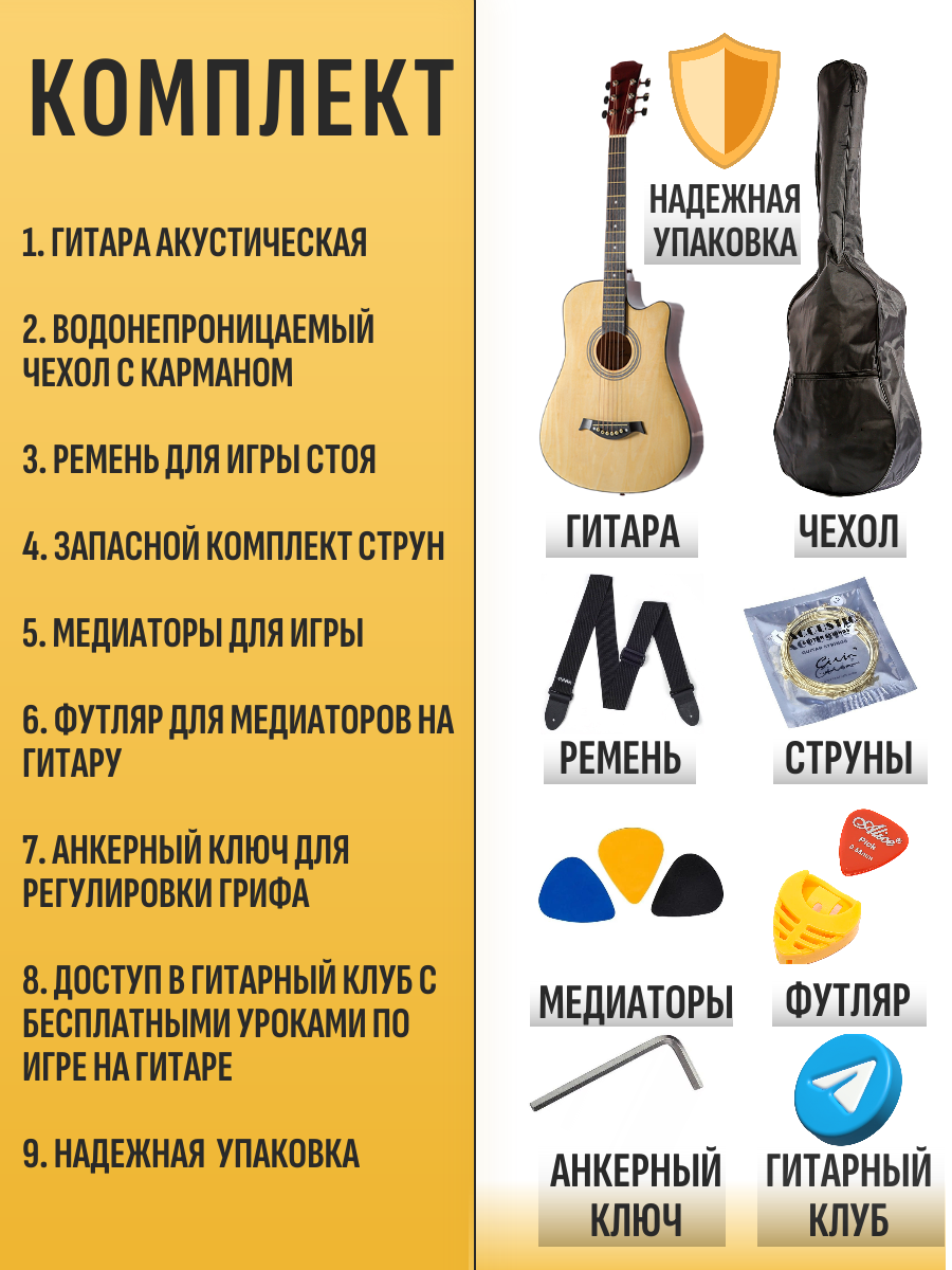 Набор гитариста: гитара с чехлом, запасной комплект струн, ремень, медиаторы для игры, футляр для медиаторов, анкерный ключ, надежная упаковка, доступ в онлайн школу в подарок