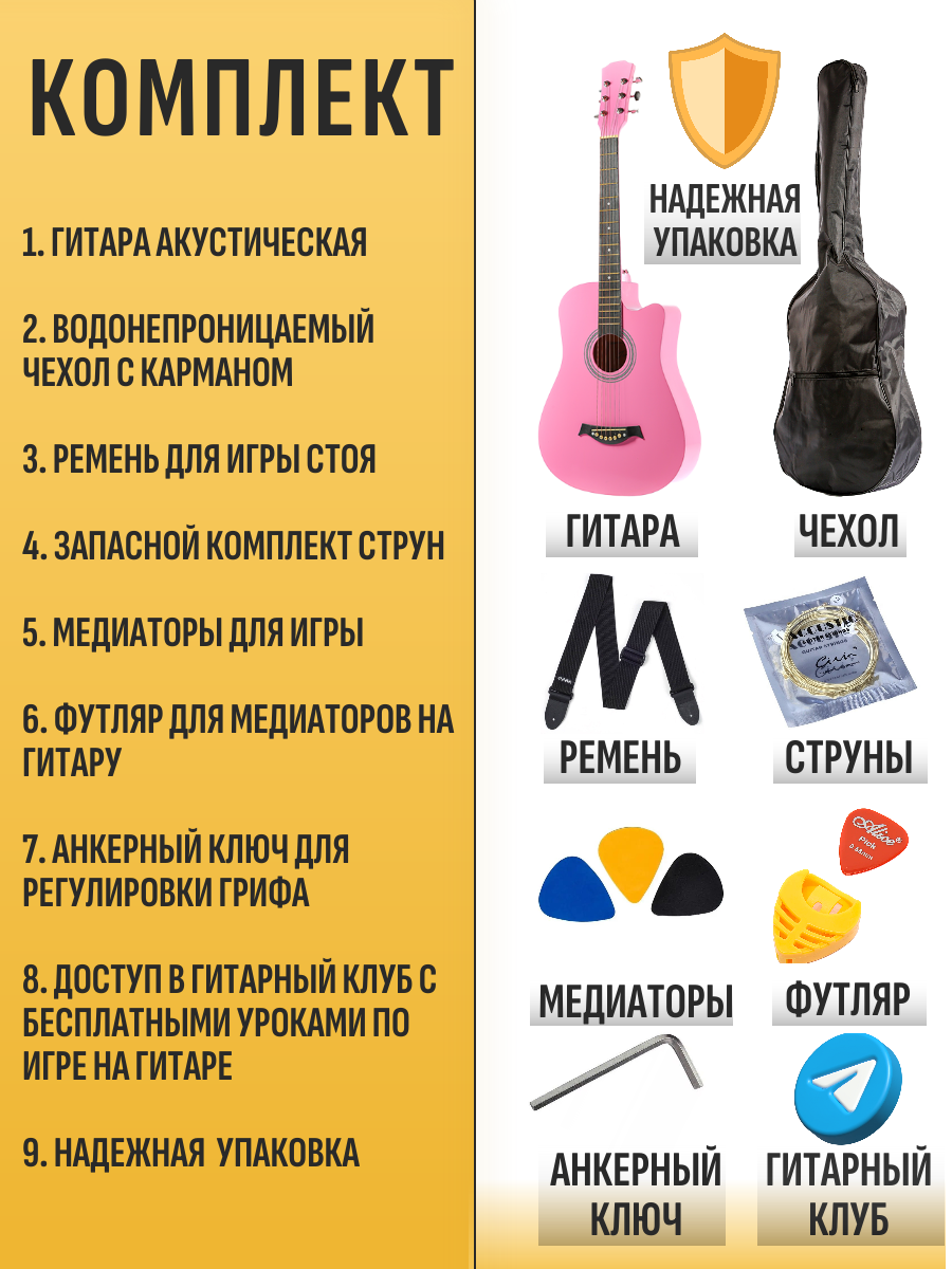 Набор гитариста: гитара с чехлом, запасной комплект струн, ремень, медиаторы для игры, футляр для медиаторов, анкерный ключ, надежная упаковка, доступ в онлайн школу в подарок