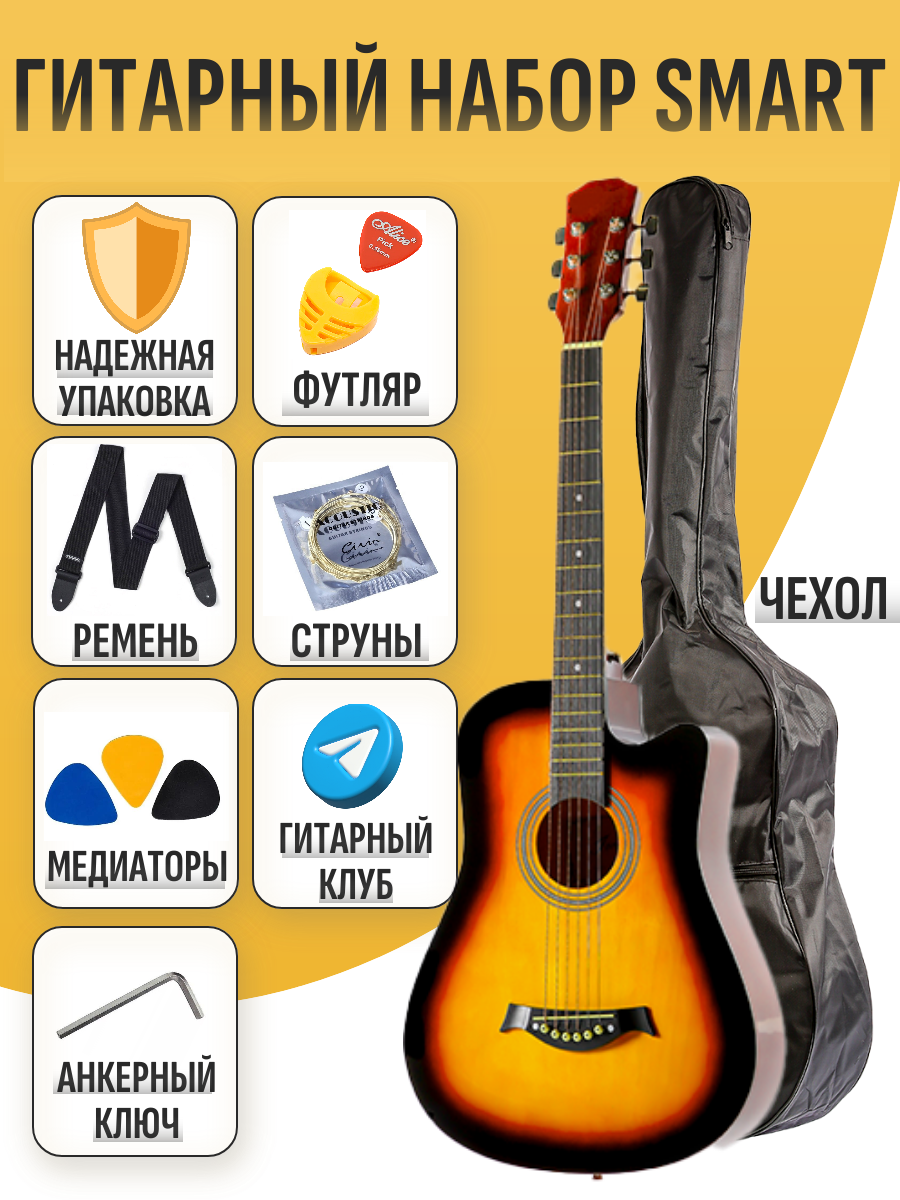 Набор гитариста: гитара с чехлом, запасной комплект струн, ремень, медиаторы для игры, футляр для медиаторов, анкерный ключ, надежная упаковка, доступ в онлайн школу в подарок