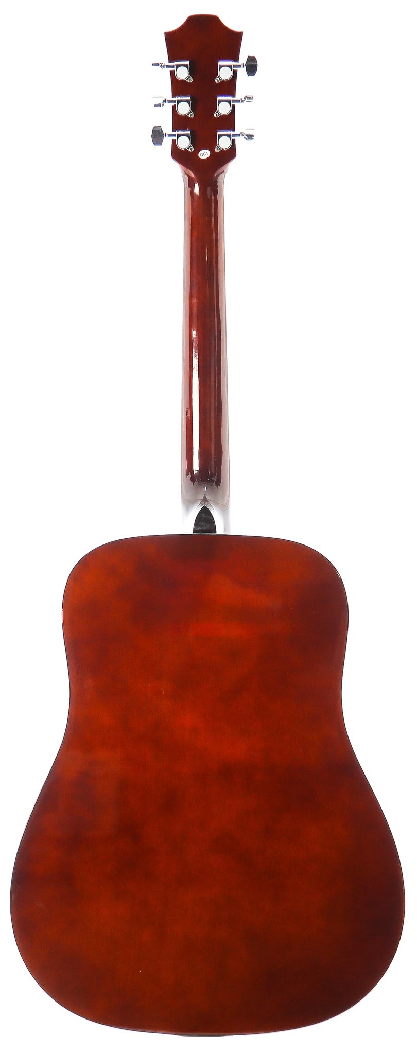 - Максимально громкое звучание инструмента достигается за счет увеличенной формы (Дредноут), а благодаря полноценному корпусу (без выреза), в сочетании с верхней декой из ели, а нижней деки и обечайки из красного дерева, достигается неповторимый объём звука и баланс по низким, средним и высоким частотам