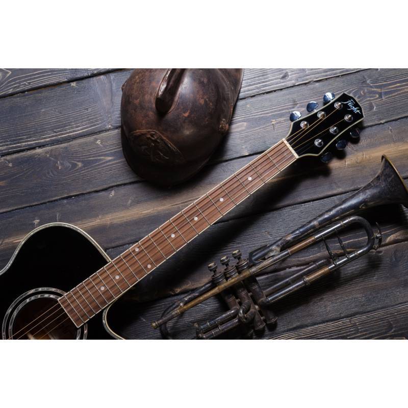 Размер корпуса FLIGHT F230C немного меньше, чем у гитар с корпусом типа «дредноут» или «вестерн». Он ближе к размеру классической гитары, при этом на инструменте установлены металлические струны, которые дают такой любимый всеми яркий звук, а вырез внизу корпуса обеспечивает удобный доступ к верхним ладам.