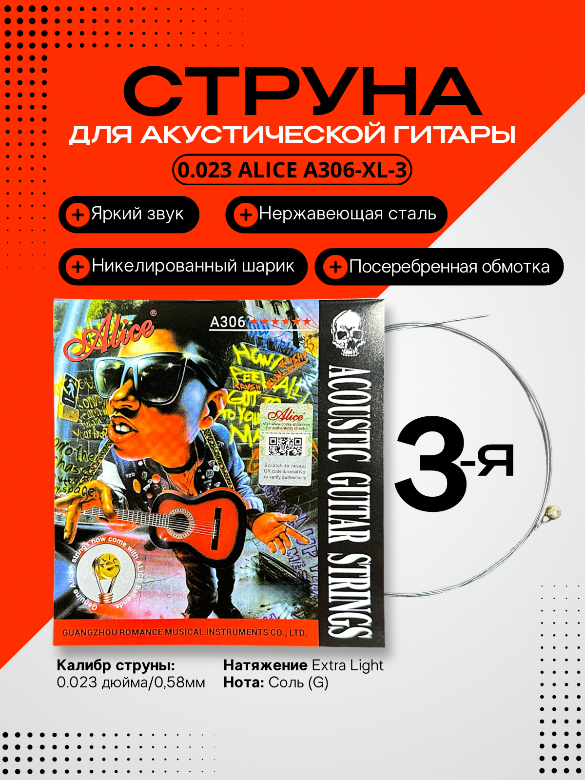 Отдельная 3-я струна для акустической гитары, 023, Alice A306-XL-3